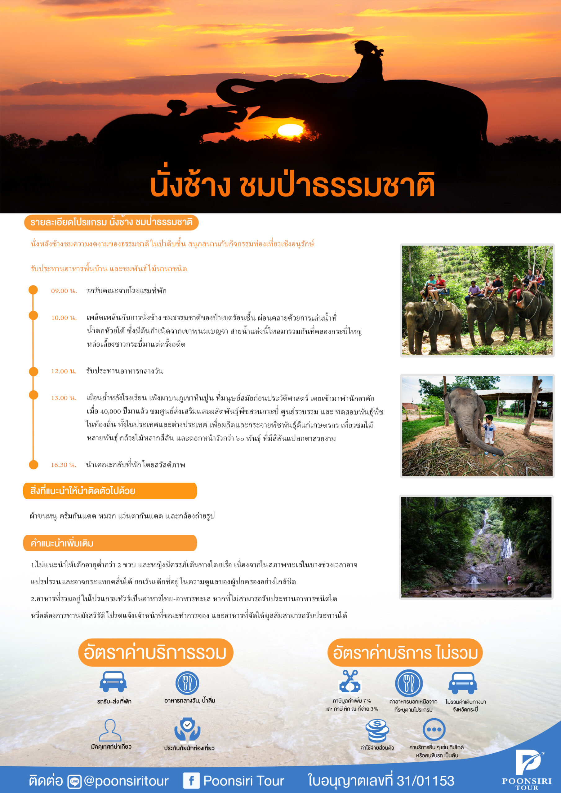 โปรแกรมนั่งช้าง ช่วงเช้า 09:00. น / 10:00. น / 11:00 น. โปรแกรมนั่งช้าง ช่วงบ่าย 13:00.น / 14:00.น / 15:00 น. กำหนดการ – นั่งบนหลังช้างชมธรรมชาติบริเวณรอบๆ ประมาณ 1 ชั่วโมง – เล่นน้ำและพักผ่อน ตามอัธยาศัย – เดินป่าโดยเท้า ไปตามเส้นทางเดินป่าศึกษาธรรมชาติโปรแกรมนั่งช้าง