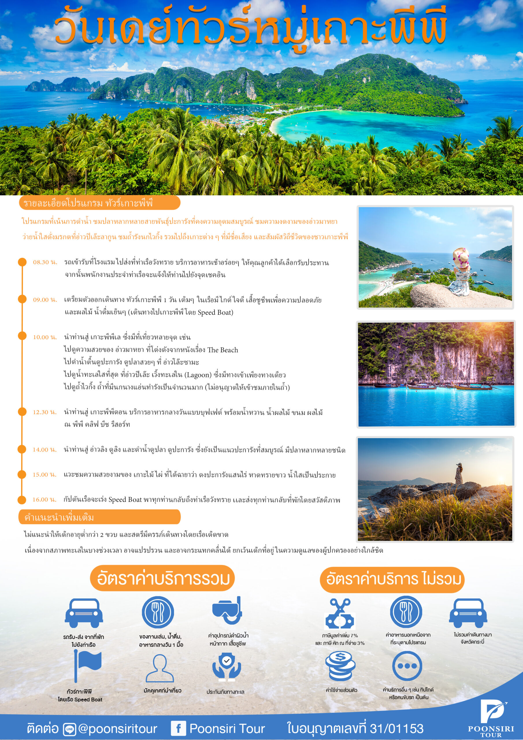 เที่ยวกระบี่แบบคุ้มค่าที่สุด ด้วยบริการที่ดีของเราทำให้ลูกค้าประทับใจในบริษัทของเรา ไม่เคยมีประวัติการโกงเงินลูกค้า ไม่เคยมีลูกค้าท่านได้จองแล้วไม่ได้ไป เรากล้ารับประกันว่าเงินที่ท่านจ่ายมาคุ้มค่าที่สุดในการพักผ่อนเที่ยวกระบี่ คำแนะนำเพิ่มเติม เกี่ยวกับเวลา : เวลาที่ระบุไว้ในโปรแกรมข้างต้นเป็นเวลาโดยประมาณเท่านั้น เวลารับส่งจริง จะขึ้นอยู่กับตำแหน่งที่ตั้งของโรงแรม หรือจุดนัดพบของท่าน สามารถตรวจสอบเวลาจริง ได้จากเอกสารยืนยันที่จะได้หลังจากได้รับการยืนยันการจอง เกี่ยวกับตำแหน่งที่นั่งบนเรือ : เนื่องจากบางช่วงของโปรแกรมทัวร์ สภาพอากาศและสภาพทะเลอาจแปรปรวน เราขอแนะนำให้ท่านนั่งในส่วนกลางหรือค่อนข้างไปทางท้ายของเรือ เพื่อลดแรงกระแทก และการโคลงของเรือ ซึ่งอาจเป็นสาเหตุของอุบัติเหตุที่เกี่ยวข้องกับกระดูกและอาการเมาเรือ เกี่ยวกับเด็กและสตรีมีครรภ์ : เราไม่แนะนำในเด็กอายุต่ำกว่า 2 ขวบ และสตรีมีครรภ์เดินทางโดยเรือเนื่องจากในสภาพทะเลในบางช่วงเวลาอาจแปรปรวนนและอาจกระแทกคลื่นได้ ยกเว้นเด็กที่อยู่ในความดูแลของผู้ปกครองอย่างใกล้ชิด เกี่ยวกับอาหาร : อาหารที่รวมอยู่ในโปรแกรมทัวร์เป็นอาหารไทย – อาหารทะเล หากท่านที่ ไม่สามารถรับประทานอาหารชนิดใดได้ หรือต้องการทานมังสวิรัติโปรดแจ้งเจ้าหน้าที่ ขณะทำการจอง และอาหารที่จัดให้มุสลิมสามารถทานได้